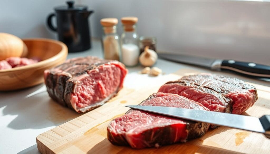 Getting your sirloin tip steak ready is all about the details. This ensures your steak is both flavorful and tender. Whether you’re grilling or using an Instant Pot, the prep work is crucial for a great taste.